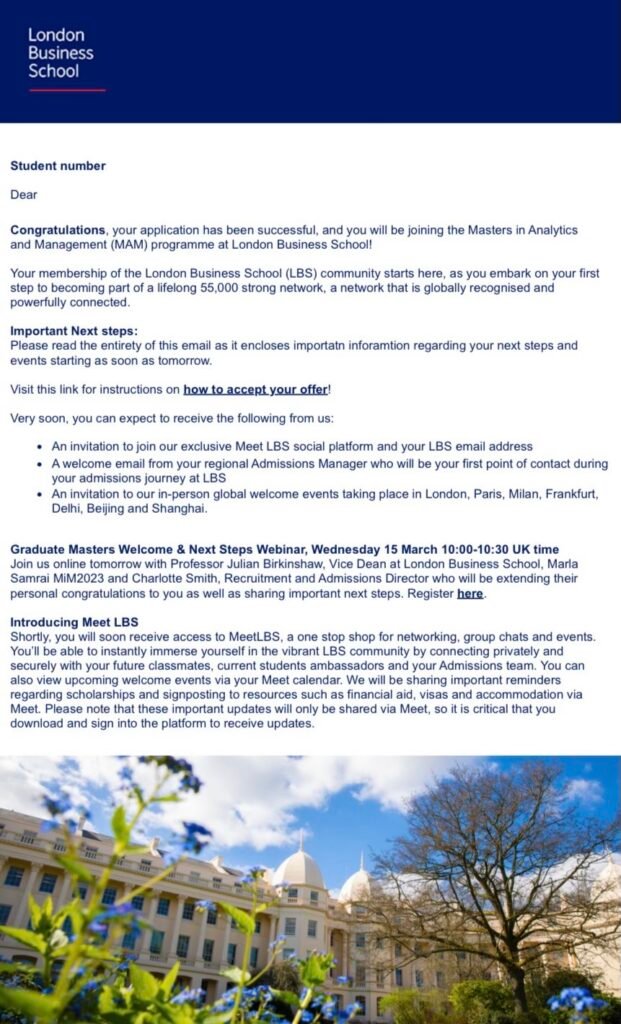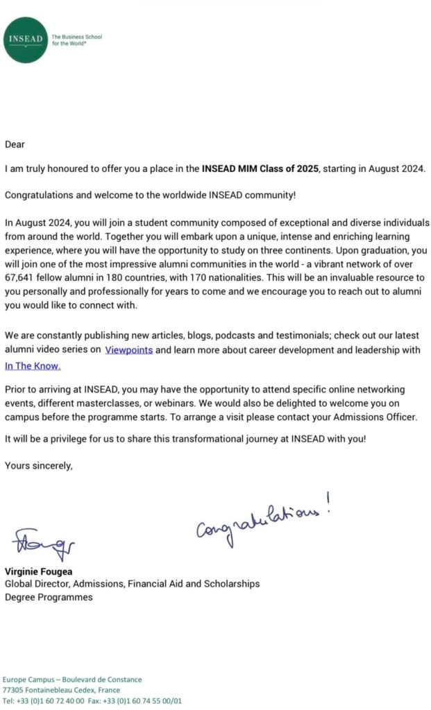 We’re proud to share that our student has secured admission into one of Europe’s top Master programs at two of Europe’s most prestigious institutions: INSEAD and London Business School (LBS). In the 2024 Financial Times European Business Schools Ranking, INSEAD claimed #1 overall, and LBS ranked #3.